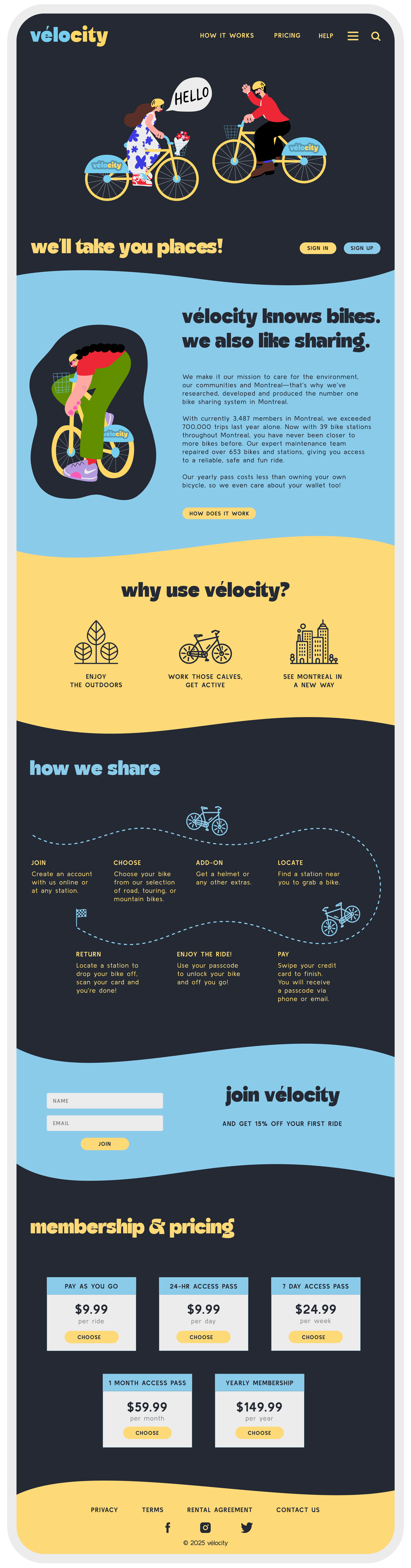 A website design for a bike sharing service in Montreal that encourages people to go green and explore the city. The design features playful illustrations, adding a fun and approachable aesthetic.